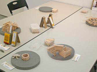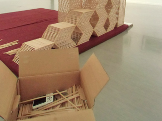 ダンボール何箱分にもなる大量の割り箸が会場に持ち込まれました。2年ぶりに割り箸アートが登場しました。お客様だけでなく百花のメンバー達も割り箸積みに没頭してしまい、思い思いの楽しい作品が出来上がってきました。