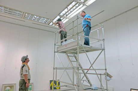 搬入日の様子です。作品の位置を決め、やぐらを使用してワイヤーやスポットライトを取り付けます。